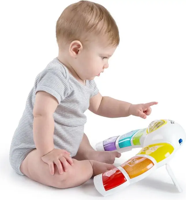Designet til at udvikle nysgerrighed med sanseoplevelser – farver, figurer, lys, musik. Gennemtænkte funktioner, der fremmer babyens udvikling. Udforsk Baby Einsteins verden med læring, musik og sjove venner. Dette legetøj er let at aktivere og sjovt og interaktiv for de små. Lyser ved at røre ved de farvede sektioner.