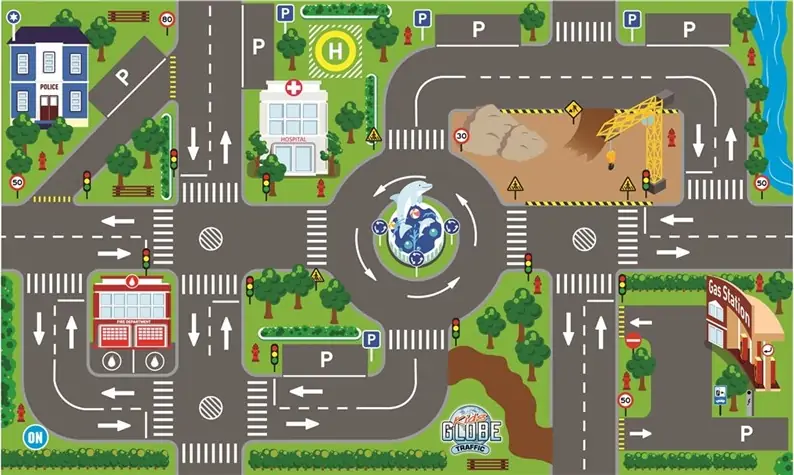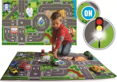 Det seje biltæppe er designet som et ægte vejsystem, hvor du kan kører rundt med alle dine yndlingsbiler. Med tæppet følger 10 fungerende trafiklys, der kan aktiveres ved at trykke på en knap. Når trafiklysene er tændt, skifter de automatisk fra rød til grøn og omvendt efter 8 sekunder, så dine lege bliver mere virkelighedsnære.