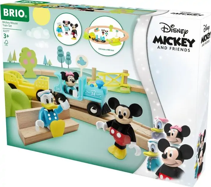 Der venter vidunderlige historier i dette Mickey Mouse togsæt med Disneytema. Tag med Mickey Mouse, Minnie Mouse og Anders And på eventyr på togbanen i træ. Med det ikoniske BRIO togbanedesign og magnetkoblinger kan dette sjove togsæt kobles sammen med andre BRIO passager- og godsvogne.