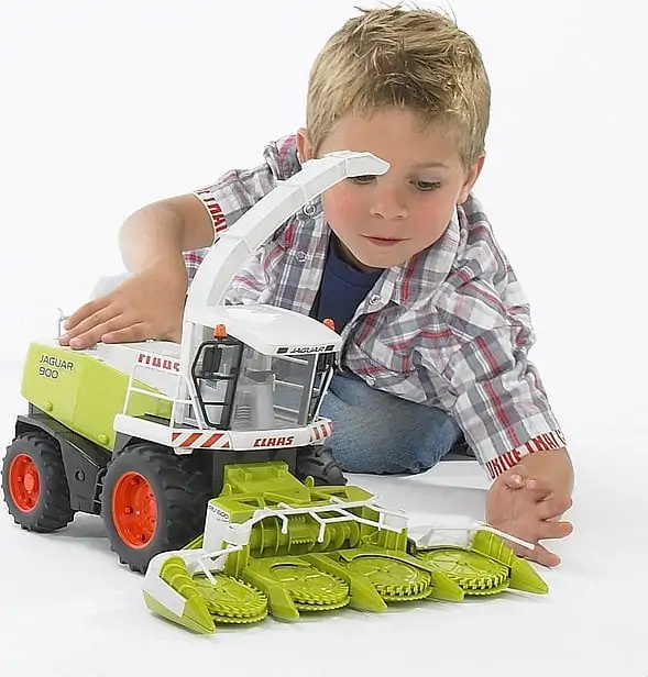 Denne Bruder mejetærsker er en flot replika af den originale Claas Jaguar 900 model. Den er kendetegnet ved skærebordet med fire pull-in klinger.