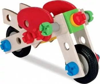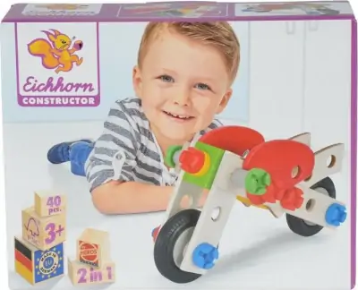 40 kvalitets træbrikker og tilbehør kan skrues sammen til enten en motorcykel eller fly med 2-i-1 sættet fra Eichhorn Constructor.