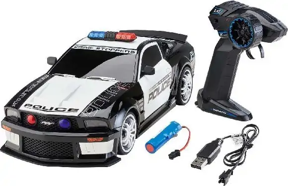 Nu er det dig, der er politibetjenten! Med denne Ford Mustang fjernstyret politibil kan du nemt og hurtigt fange alle de kriminelle. Dit udrykningskøretøj er godt udstyret med blå lys og sirener, så ingen er i tvivl om, at du er på vej. Derudover er bilen udstyret med LED forlygter, som sikrer dig perfekt sigtbarhed i mørket, og du kan komme helt op på 10 km/t. Du kan kontrollere din Ford Mustang med den smarte 2,4 GHz fjernbetjening, og med denne fjernstyring kan flere af dine venner køre sammen med dig på samme tid, uden at køretøjerne forstyrrer hinanden.