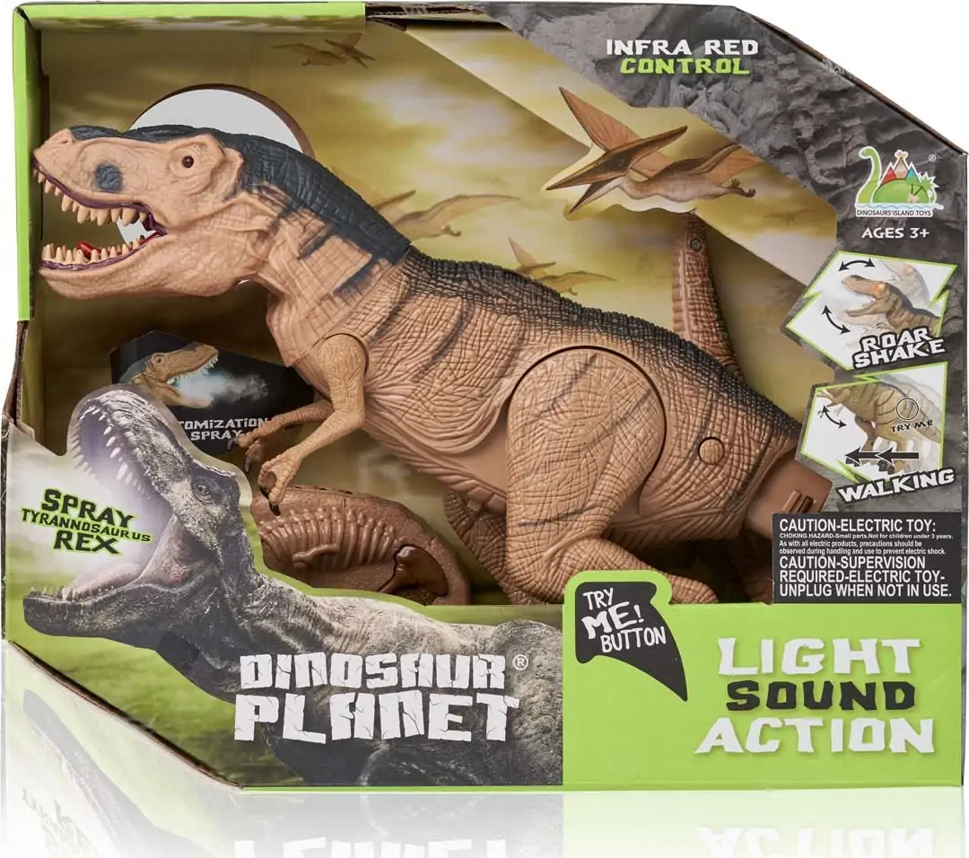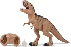 Dinosauren har både lys og lyd, og kommer i en brunlig farve med sorte klør og striber.
