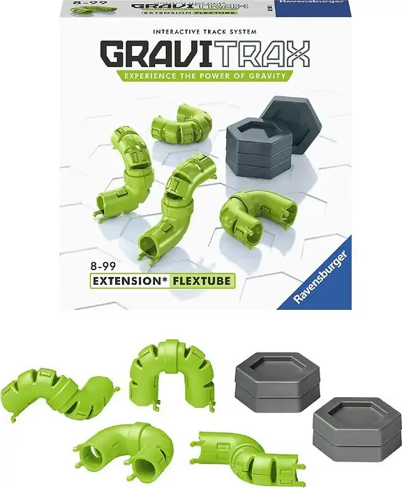 FlexTube gør det nemt for dig at forbinde din banes forskellige niveauer. Det, der kommer op, må komme ned, og med denne udvidelse kan du nemt ændre dine kuglers retning. FlexTube kan nemt tilpasses 60-graders vinkler, u-former og s-former. Kombineret med et Starter sæt, kan du også styre kuglernes hastighed på din bane.
