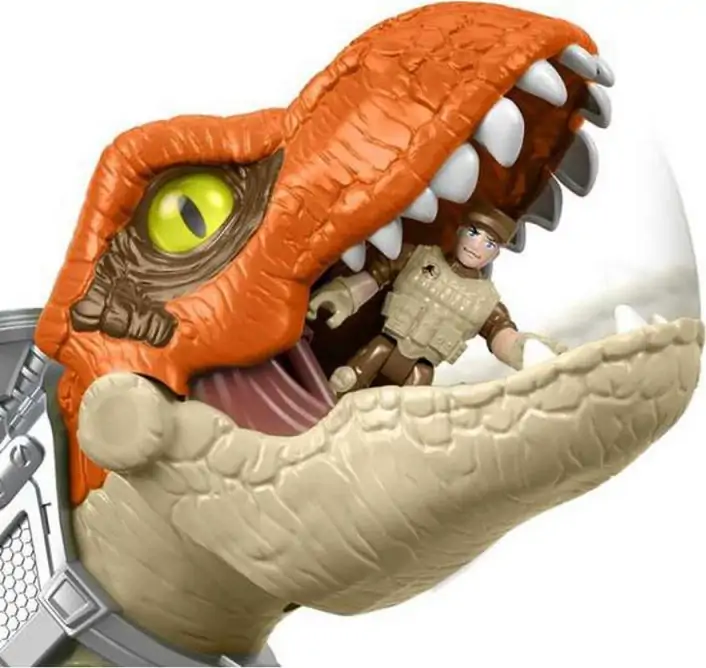 Skab spændende Jurassic World-eventyr med Dr. Alan Grant og denne gigantiske Tyrannosaurus Rex, der kan bide en figur og sluge den, så figuren ender i dens mave!