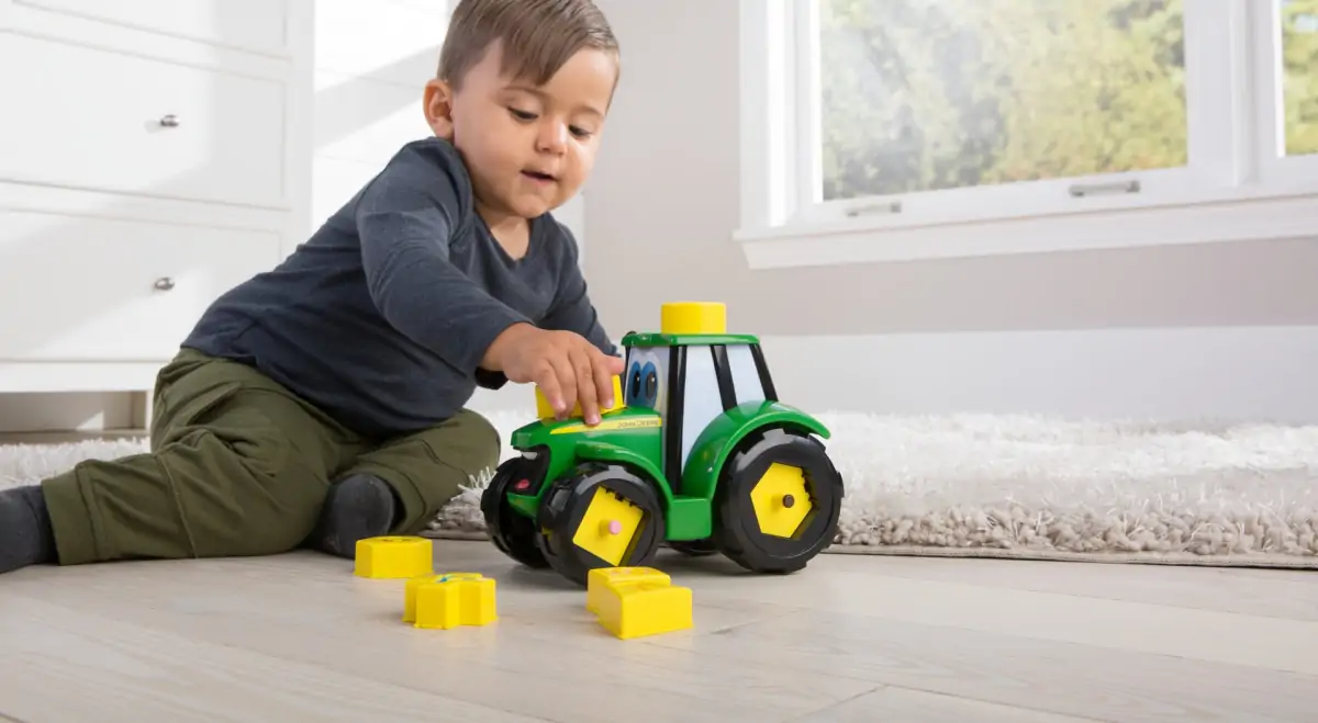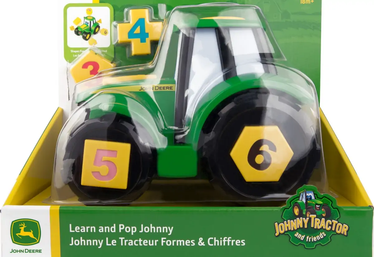 Lad dit barn have endeløst sjov med John Deeres lær og leg Johnny Traktor. Put klodserne i de rigtige huller – her lærer børnene både om former og tal – og når du giver Johnny et skub, vil klodserne hoppe ud igen.