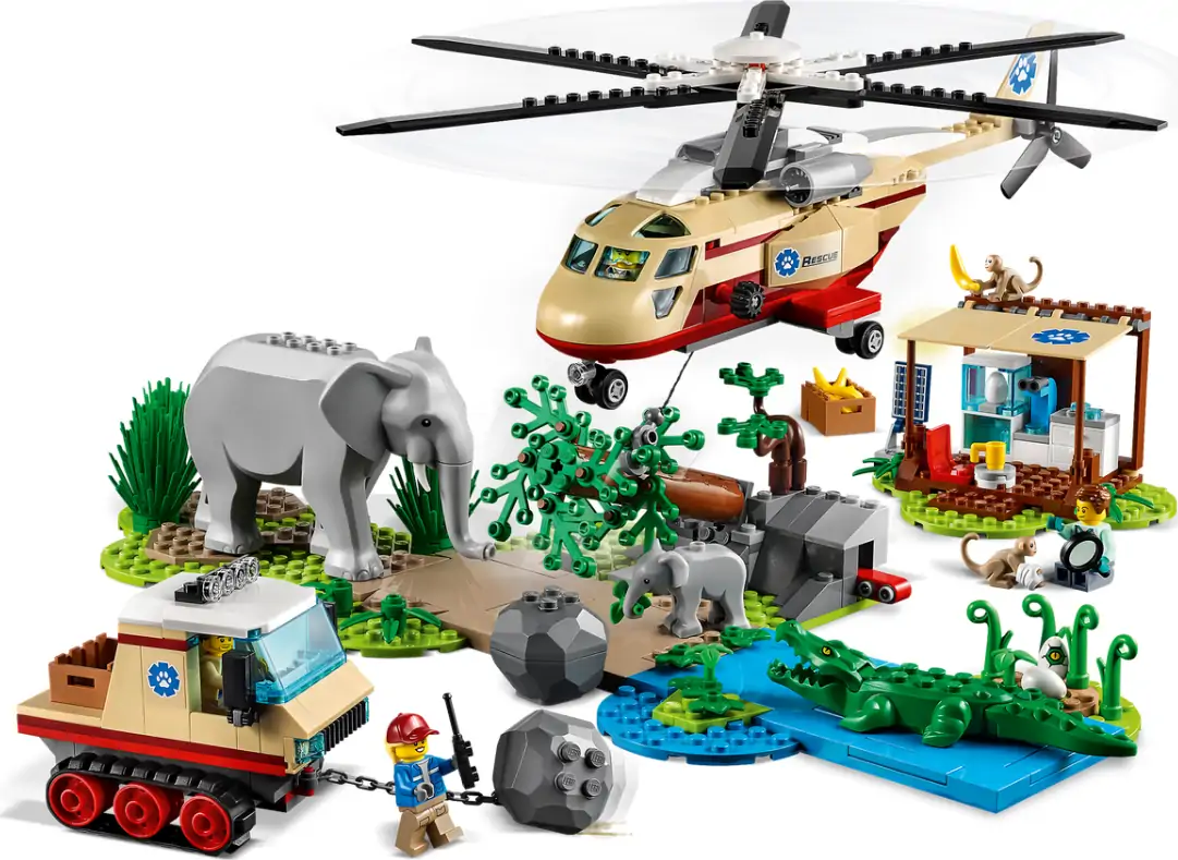 LEGO® City Vildtredningsaktion indeholder flere modeller og er fyldt med fantastiske detaljer og funktioner, bl.a. en cool helikopter med kranspil, bæltekøretøj, savannescene med jordskredsfunktion og en dyrlægestation. Bare tilføj de medfølgende elefanter, krokodiller, abe og redningshold for at opleve timevis af sjove og spændende dyreredningsmissioner.