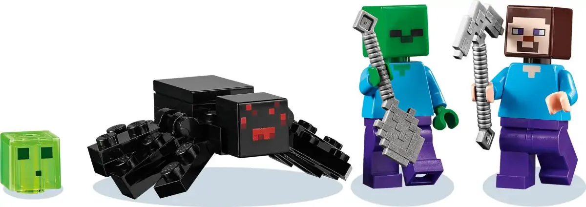 Det smarte sæt indeholder velkendte Minecraft-figurer og væsner, og du kan bl.a. glæde dig til at møde Steve, en zombie, en edderkop og levende slim. Ydermere er sættet bestående af kul-, jern- og diamantelementer samt en faldende grusfunktion, så du kan fange de fjendtlige væsner.