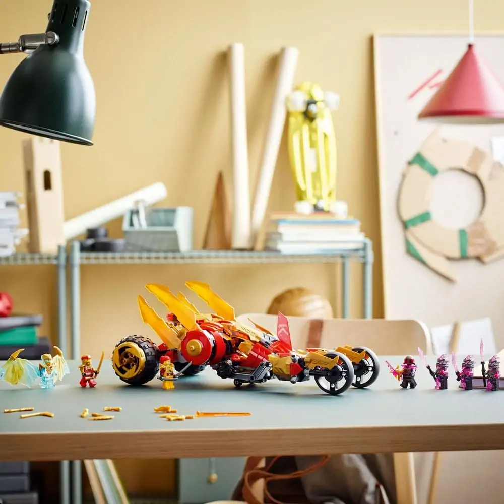 Ninjafans fra 8 år kan genskabe vild action fra tv-serien NINJAGO®: Krystalliseret med det supercool legesæt Kais gyldne drage-angriber (71773). Det omfatter et terrængående køretøj med cockpit, 2 kanoner med 4 skydere og gyldne drageklinger. Ved at folde angriberens baghjul kan det omdannes fra vejtilstand til ganger-tilstand og bevæge sig som et væsen.