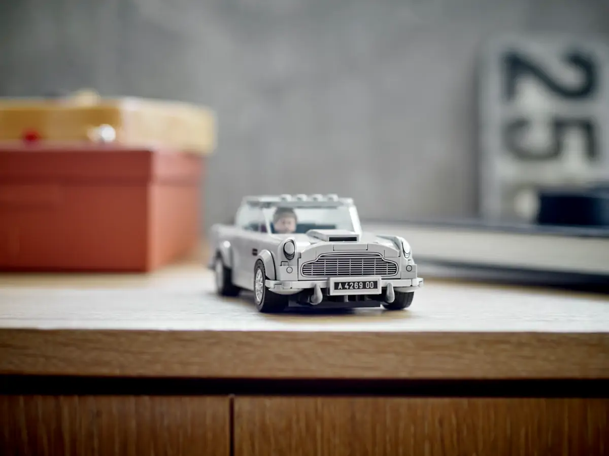 Æsken inkluderer alt, hvad der skal bruges for at bygge en LEGO® fortolkning af 007 Aston Martin DB5 samt en minifigur af James Bond™ fra No Time To Die med en skruenøgle.