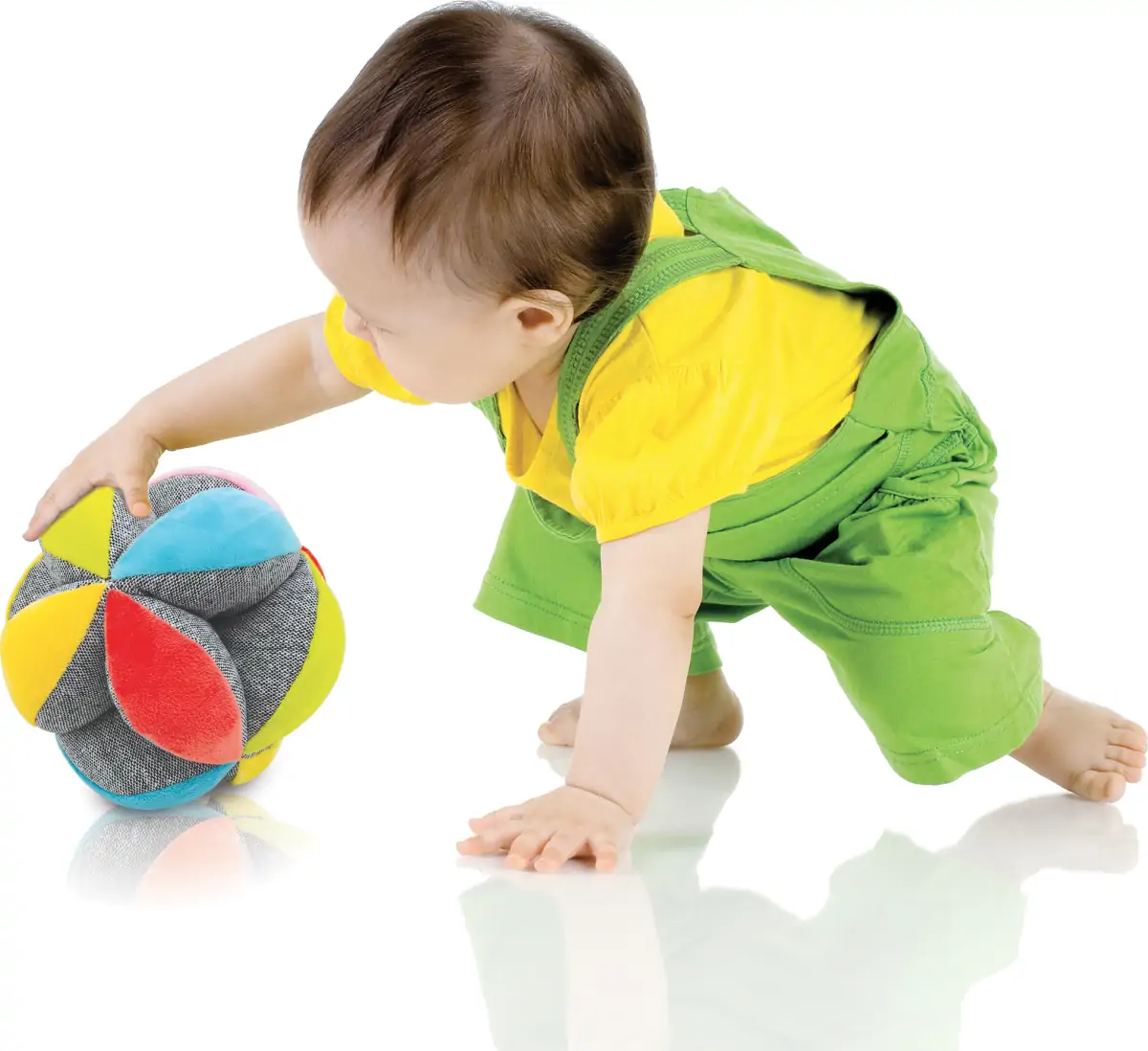 Lær, hvordan man triller, kaster og griber en bold med denne bold, der er designet til at være let at gribe fat om for de små. Den er produceret i blødt stof, og de klare farver understreger dens specielle form, der forhindrer bolden i at trille for langt væk.