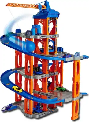Med 5 forskellige niveauer er denne store parkeringskælder det perfekte legetøj for unge bilelskere. Garagen på 53 x 56 x 73 cm har en motordrevet lift (batterier medfølger ikke), en tankstation, en 360° kran med en nedbrydningskugle, en vaskehal, en liftplatform og spændende ramper til hurtig action. Sættet inkluderer også 5 metallegetøjsbiler – en Lamborghini Aventador, Audi R8 Spyder, Jeep Wrangler, Ford GT og en Renault Twingo, som alle har roterende hjul, affjedring og et metalchassis. Garagen og bilerne har et meget holdbart design og er en ideel gave til børn fra 5 år og op.