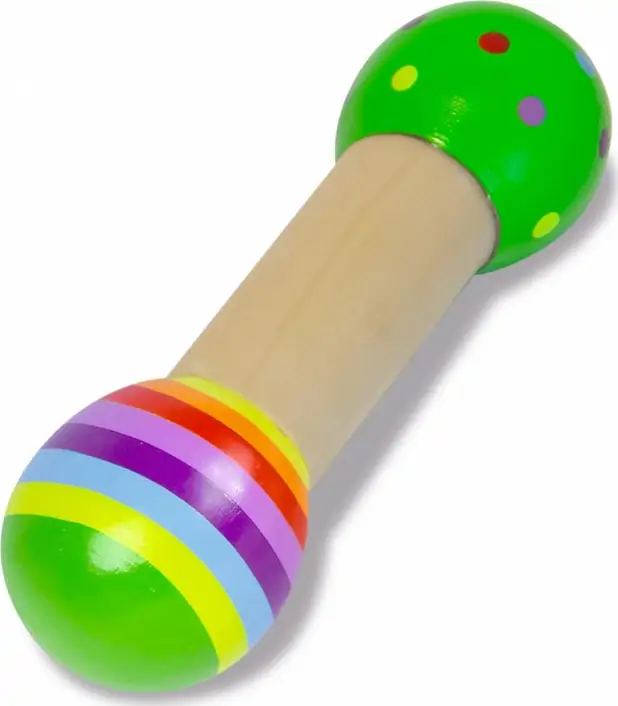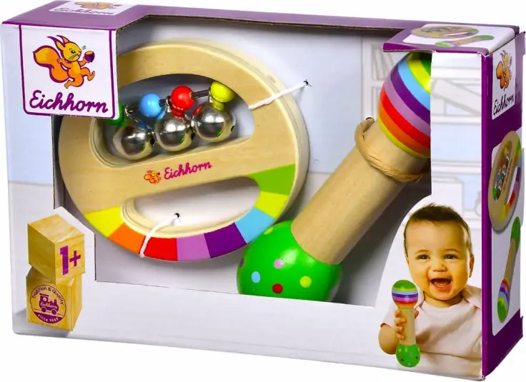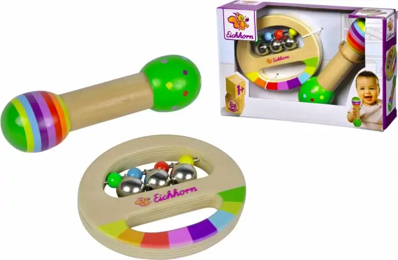 Det ene instrument er en børneudgave af en tamporin, der har små klokker og en håndtag. Det andet instrument er en raslepind med forskellige lyde i begge ender.