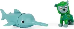I dette sæt får du Rocky i hans helt nye våddragtsuniform og hans loyale savfisk-ven. Rocky er klar til at tage på redningsmissioner! Sæt Rocky fast oven på savfiskens finne og rul savfisken fremad for at aktivere dens sjove bevægelser.