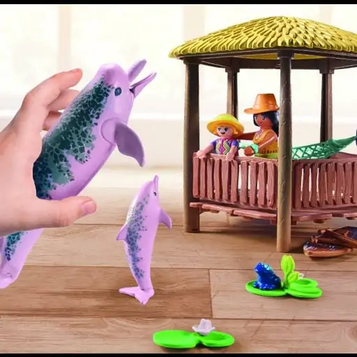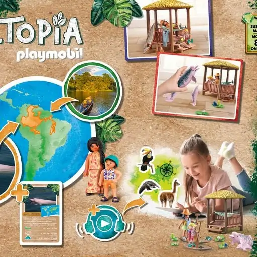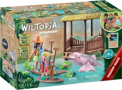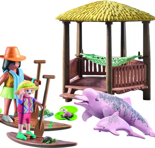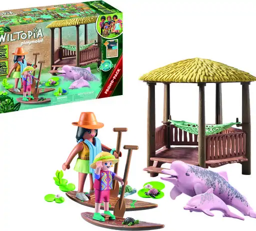 Oplev WILTOPIA, den første miljøvenlige produktline fra PLAYMOBIL fremstillet af gennemsnitligt mere end 80 % bæredygtigt materiale. Stand-Up-Paddling giver god mulighed for at se på de sjældne floddelfiner. Inkl. to SUP-boards og hytte til at hvile ud i. Begge delfiner kan svømme. Med masser af tilbehør og videnskort om floddelfinen med spændende audio-indhold.