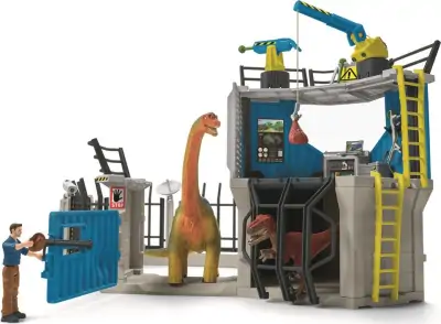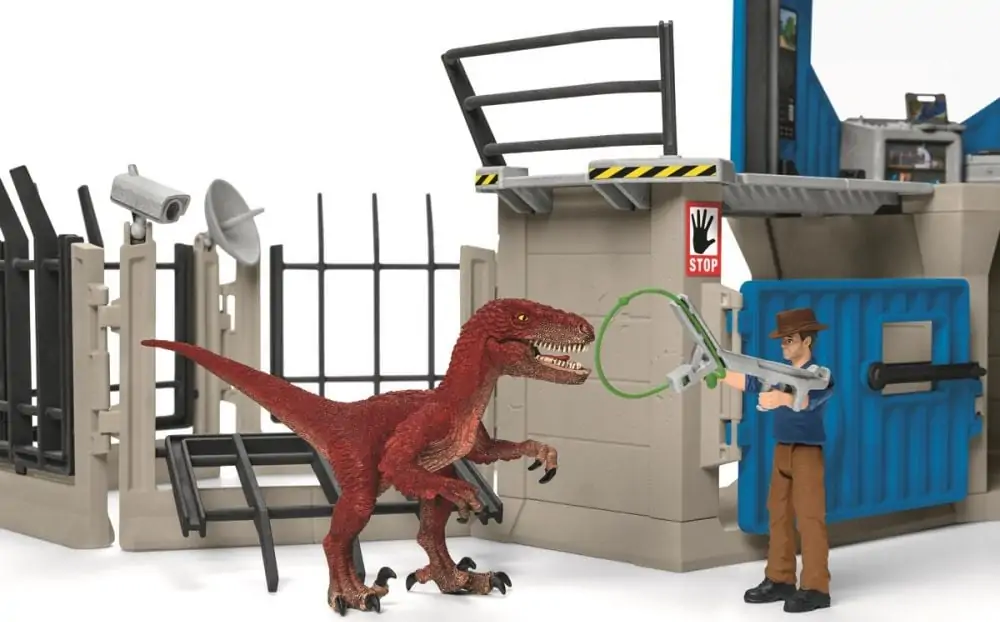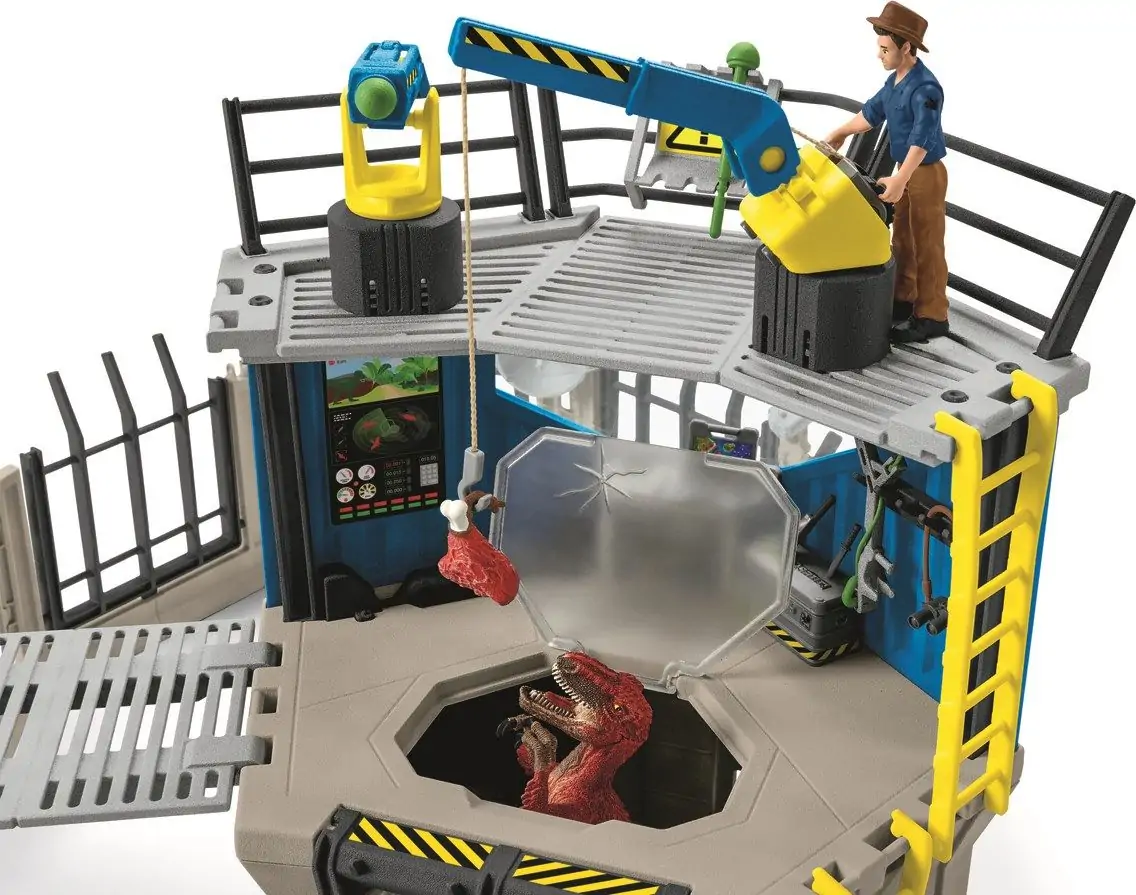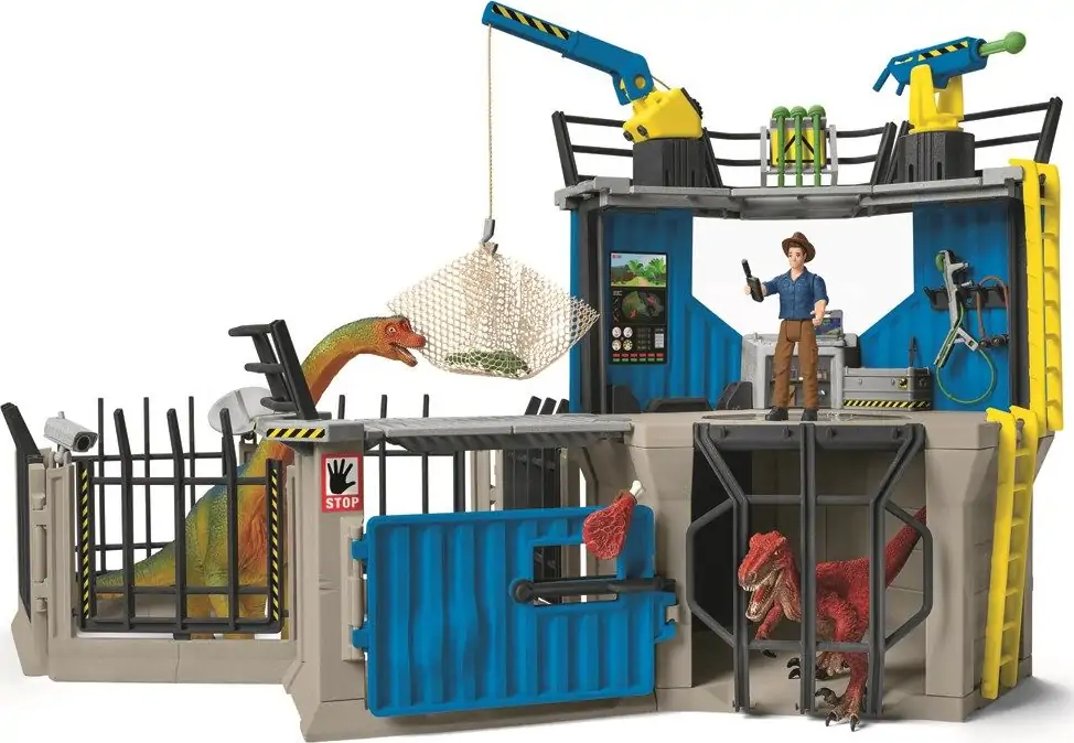 TEAM DINO, der består af de 3 Colby brødre Maxx, Luis og Flynn tager afsted for at afsløre hemmeligheder! Lederen Maxx har rigtig travlt på den store Dino-Forskningsstation fra Schleich® Dinosaurs. Ud over kommandocentralen råder stationen over en udsigtsplatform med drejelig bedøvelsespil-kanon, plus en kran. I det nederste område er der et karantænerum til ny-indfangne dinoer. Her kan de første undersøgelser straks gå i gang og derefter kan dyrene slippes ind i indhegningen gennem faldlemmen.