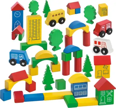 Med disse 75 farverige træklodser får børn mulighed for at bygge en lille by.
