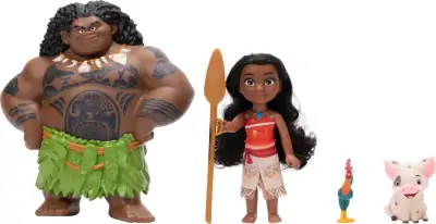 Vaiana er iført hendes eventyroutfit og er klar på hvad som helst med hendes praktiske åre og Maui ved hendes side! Pua og Heihei er der også for at være med på de sjove eventyr. Dette sæt er perfekt til enhver Vaiana fan!
