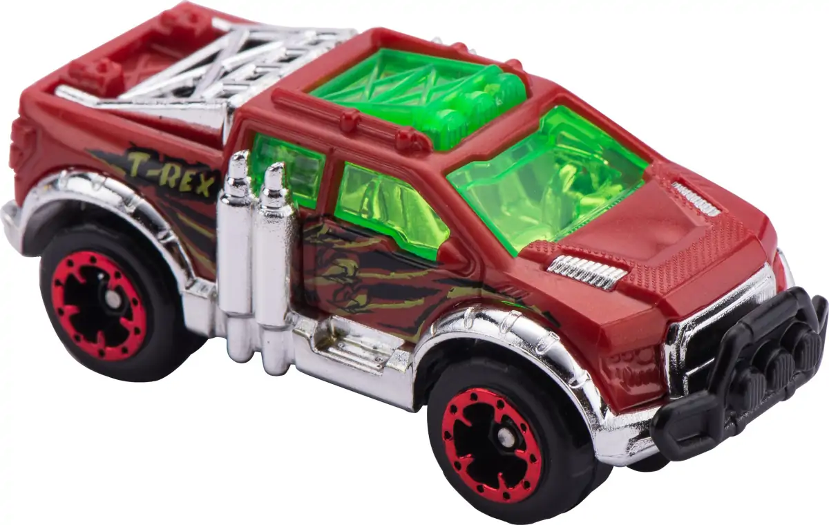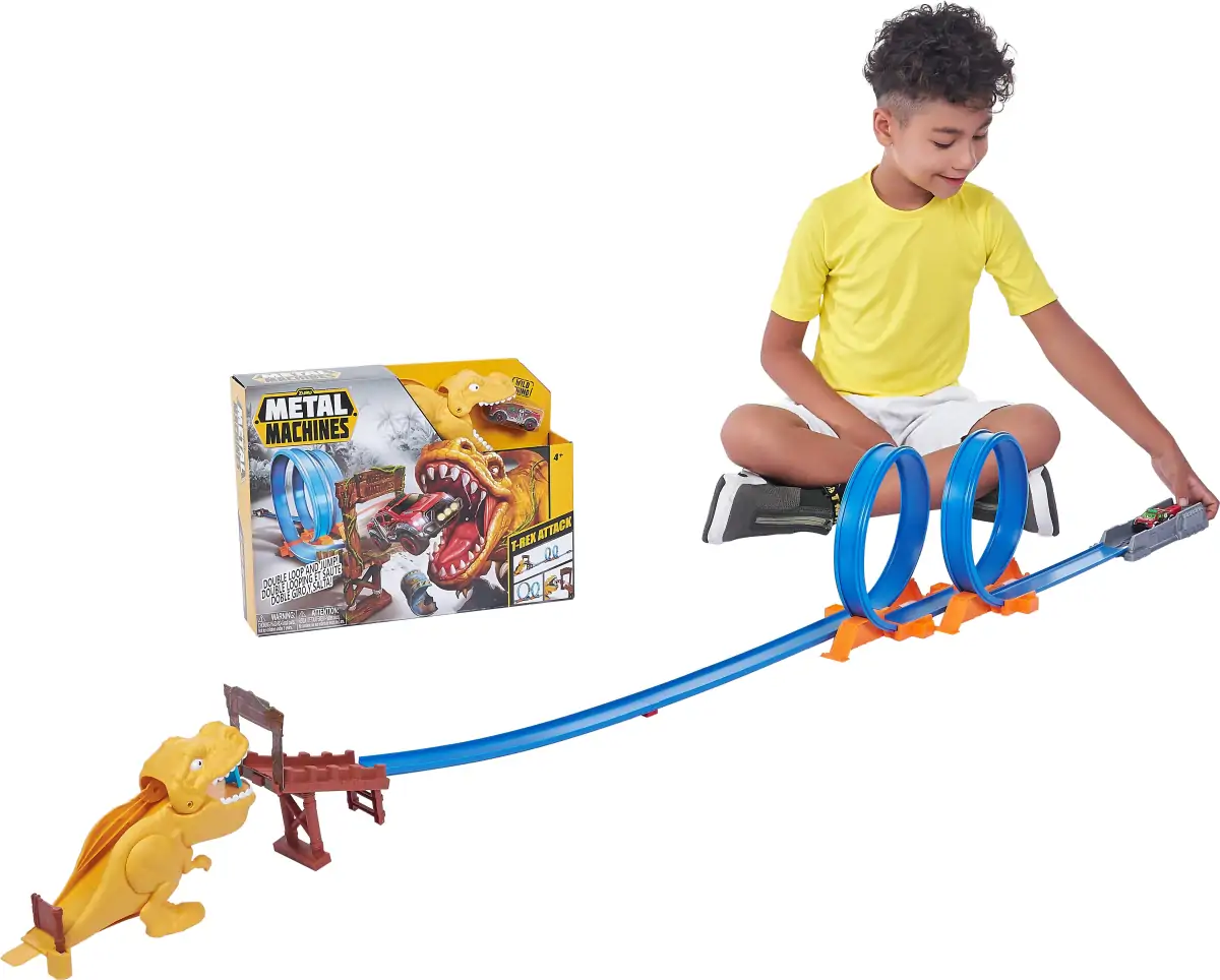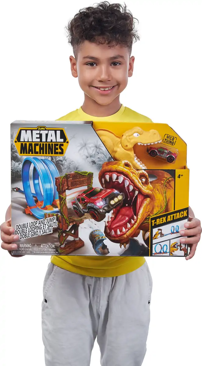 Kan du få tilstrækkelig fart på din Wild Thing Metal Machine til at komme forbi det dobbelte 360-loop og lige ind igennem T-Rex og slå den omkuld, eller bliver du til dino-mad? Der er kun en måde at finde ud af det på!